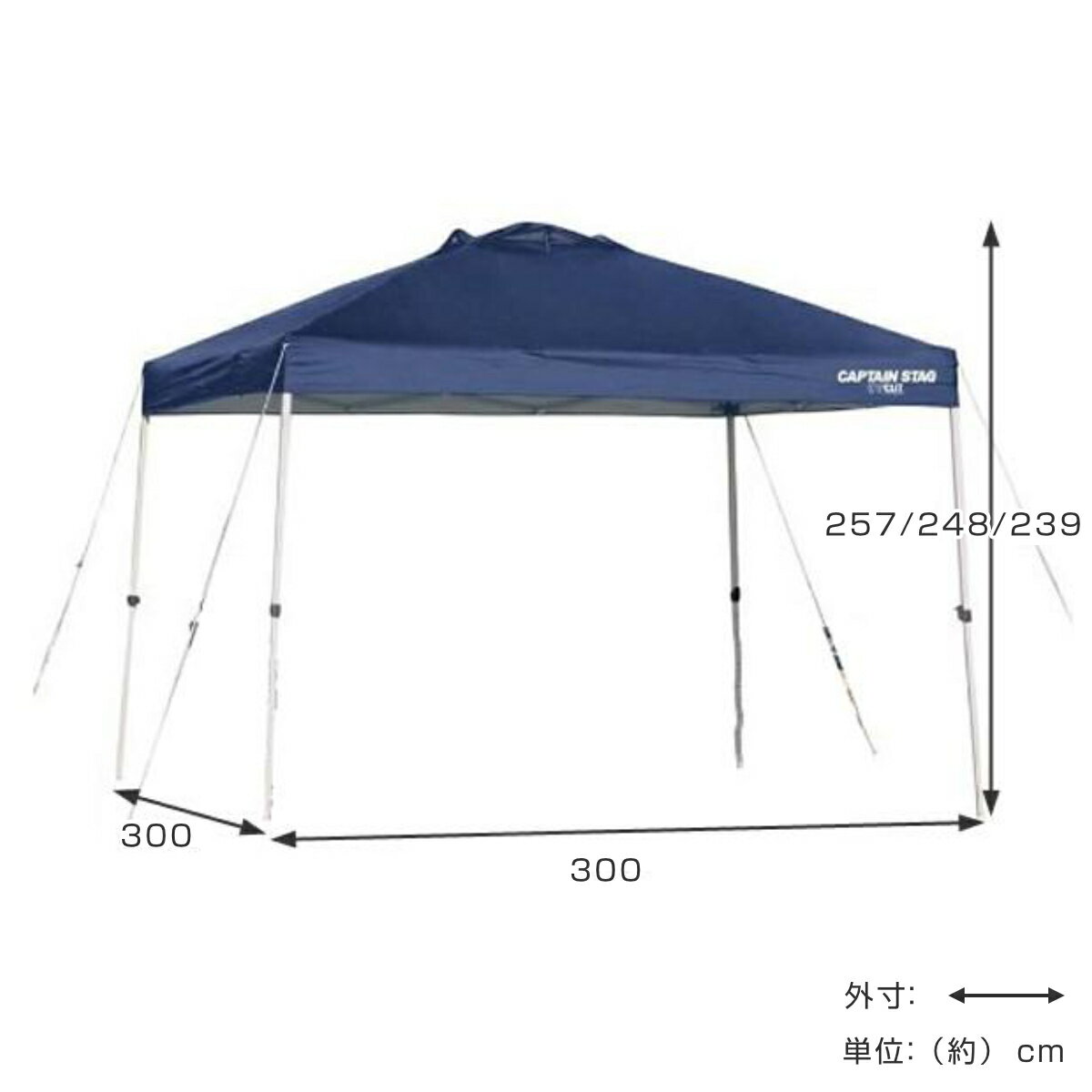 サイズ約 幅300×奥行300×高さ257・248・239(cm)収納サイズ:約 幅124×奥行21×高さ21(cm)重量:約15kg内容量1張り(付属品:ペグ8本、ガイドロープ4本、ペグ用収納袋1枚、キャスター付きバッグ1枚)材質【フライ】ポリエステル150D・シルバーコーティング(1000mm防水)、UV加工【フレーム】支柱:アルミルーフ・クロスバー:鉄(紛体塗装)生産国中国製備考※画像に使用しているテーブルや椅子などの小物は付属いたしません。